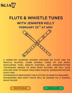 A hands on learning session focused on flue and tin whistle players. Learn several tunes by ear while developing tone, breath control and ornamentation techniques unique to Irish wind playing. We will also explore how to shape your own musical expression within each tune. Intermediate proficiency on flute or tin whistle required.