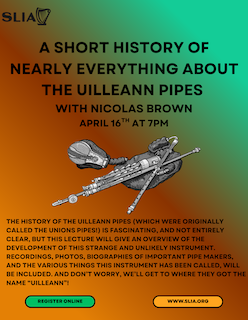 The history of the uilleann pipes (whih were originally alled the union pipes) is fascinating, and not entirely clear, but this lecture will give an overview of the development of this strange and unlikely instrument. Recordings, photos, biographies of important pipe makers, and the various things this instrument has been called will be included. And don't worry, we'll get to where they go the name "uilleann!"