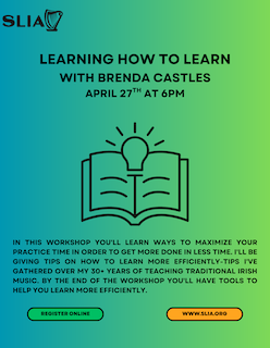 In this workshop you'll learn ways to maximize your practice time in order to get more done in less time. Brenda will be giving tips on how to learn more efficiently - tips she's gathered over her 30+ years of teaching traditional Irish music. By the end of the workshop you'll have tools to help you learn more efficiently.
